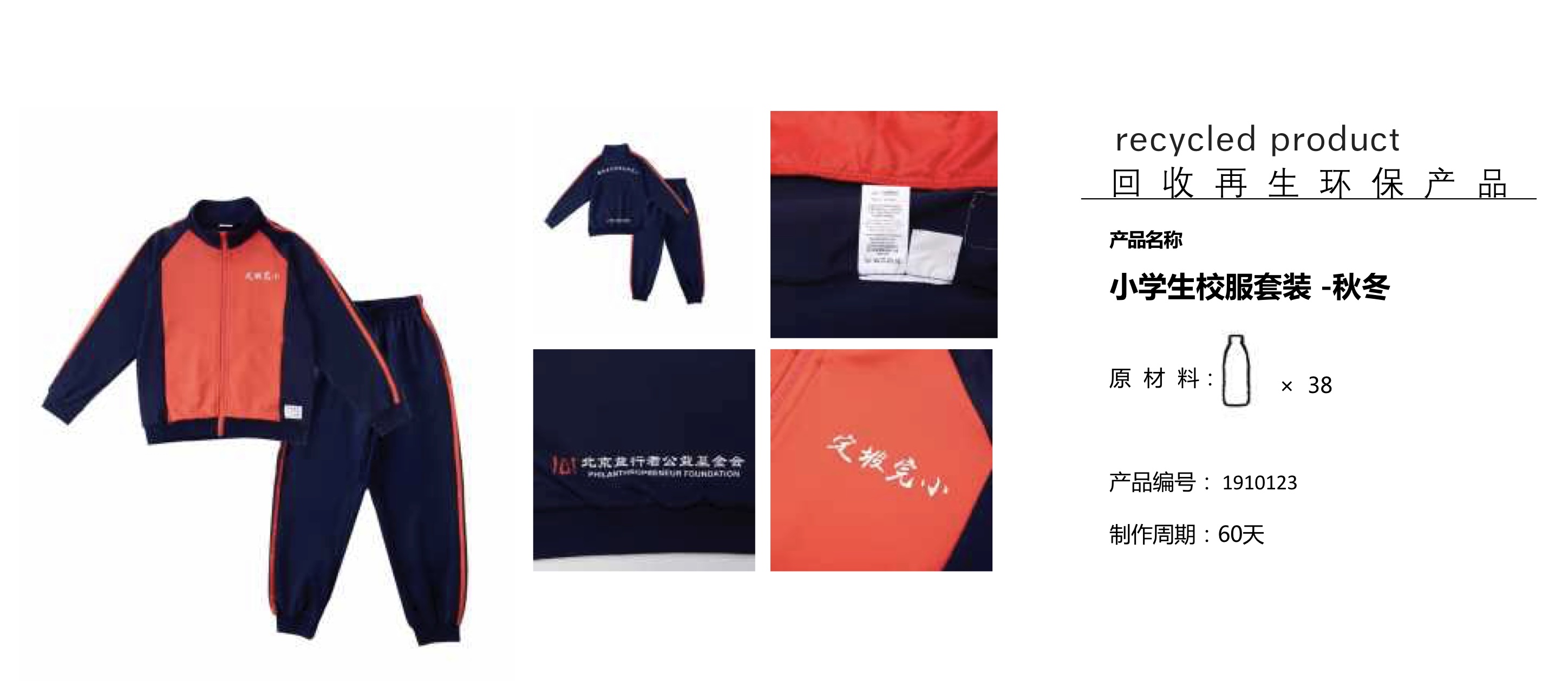 P.E.T.上海好润环保携手上海真爱梦想基金会募资废弃塑料瓶与资金,并把资源变成环保校服后捐赠。每一套校服都由38个回收塑料瓶制成,使用工艺均为最高等级。