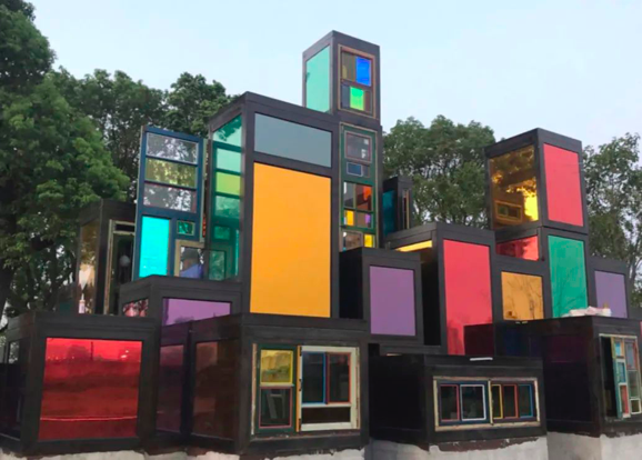 宋冬创作的另外一个装置是上海杨浦区的一个永久性城市雕塑,叫《若冲园》。他把收集起来的那些窗户重新连接成一个作品。这是我们说到的:城市拆迁之后,艺术在行动。