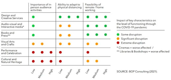 2020年各国文化创意产业GVA和国家GDP条形图疫情期间,创意产业受到的冲击非常明显。这跟其自身特点有关:第一,它高度依赖公共场所人群聚集;第二,从事艺术工作和文化产业的大多是小微企业和个体从业者,他们的抗风险能力不如一些大企业。