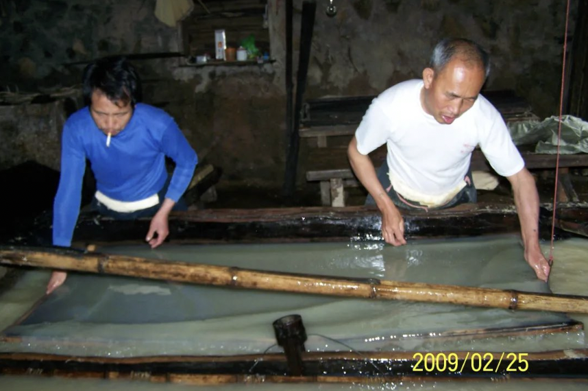▲ 覆簾压纸,荡料入簾。玉扣纸的整个制作基本步骤与明末清初的造纸术相类似。图片来源:受访者提供