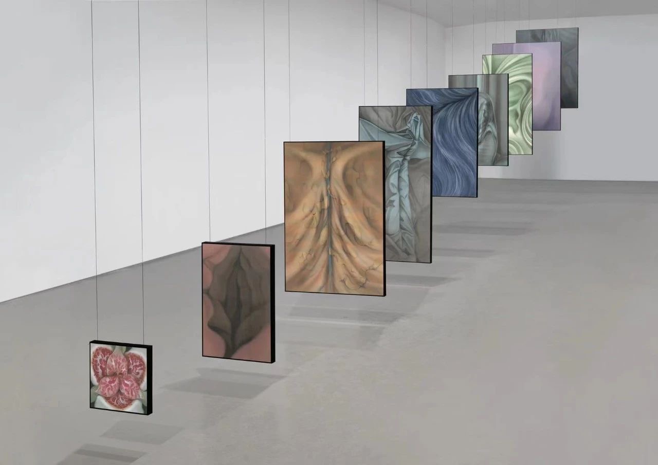 马灵丽:我之前看了一部博尔赫斯的短篇《环形废墟》,文中描述了一个梦中的巨人,在梦里,第一天出现的是巨人的心脏,然后到毛发,再到骨骼。句句都是从微观出发的真实物体,当你在脑海里回望时,会呈现出一个整体的巨人形象,但我相信每个人脑海中的巨人形象都是千奇百怪的,直至最后留下的是一个关于巨人的感觉,一场梦。而我创作《宴》时,以层叠的方式,将身体局部串联挂在空间里,人可以在画中游走,一边观看一边忘记,最后回望你才知道你看到的整体是什么,不在眼睛里,而是在心中,是一场关于虚实的梦境。