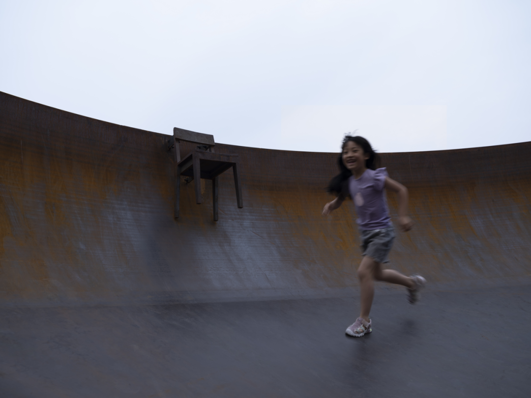 海报上有我的一个作品《隐喻的象征物》,大家出门右拐就能看见它,人们叫它“大碗”,是把几十吨钢板击打出一个碗状的弧形空间来,是通过击打争取出来的一个空间。在一开始我就把它比喻成怀孕母亲的肚子,是作为母亲的肚子被生命撑起来的形状,像一个倒置的穹顶,它是有关生命的孕育和挣扎。让我非常欣慰的是,这个真的得到了小孩子们的喜欢,他们像是回到妈妈的肚子里一样自在,并没有感觉到成年人所谓的那种“危险”。